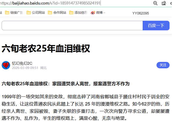 1999年的一场突如其来的变故,彻底击碎了河南省郸城县于腰庄村村民于训全的安稳生活,让这位普通农民从此踏上了长达 25 年的漫漫维权之路。如今62岁的他,历经亲人离世、家园被毁、妻子失联的多重打击,一次次向警方寻求公道,却屡屡遭遇不作为、乱作为,半生的维权路上,满是心酸、无奈与绝望。